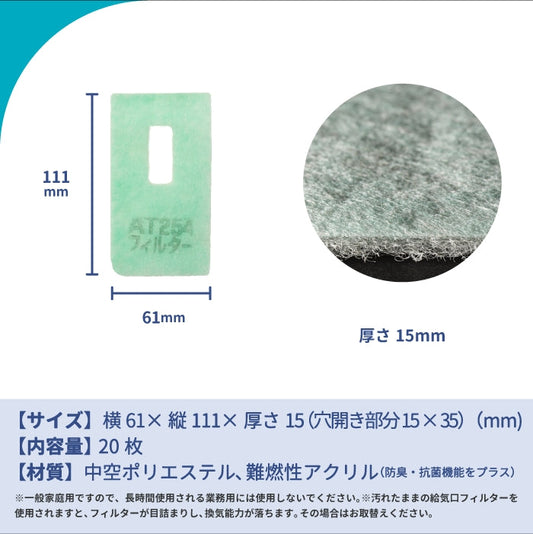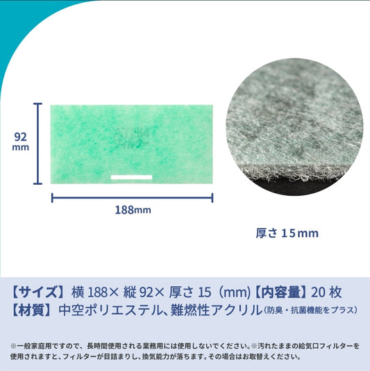 給気口グリル用【AT254】フィルター「QS7」サイズ 20枚入り 大きさ:ヨコ188mm x タテ92mm 厚さ:15mm 穴あき