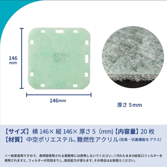 給気口グリル用【AT254】フィルター「QU10」サイズ 20枚入り 大きさ:ヨコ146mm x タテ146mm 厚さ:5mm 9が所穴あき