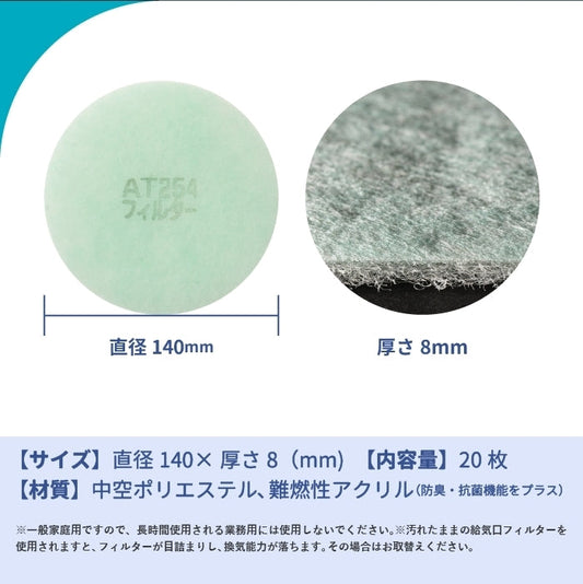 給気口グリル用【AT254】フィルター「QF2」サイズ 20枚入り 大きさ:Φ140mm 厚さ:8mm