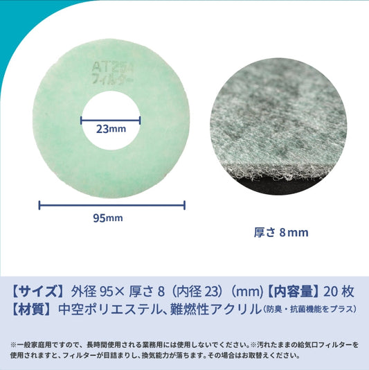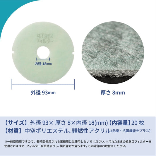 給気口グリル用【AT254】フィルター「QSE2」サイズ 20枚入り 大きさ:Φ93mm/Φ17mm 厚さ:8mm 穴あき