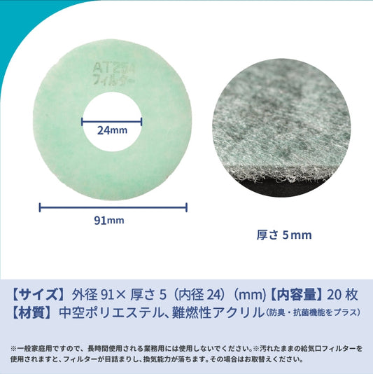給気口グリル用【AT254】フィルター「QK18」サイズ 20枚入り 大きさ:Φ91mm/Φ24mm 厚さ:5mm
