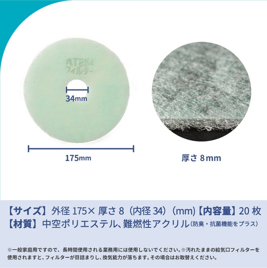 給気口グリル用【AT254】フィルター「QSE3」サイズ 20枚入り 大きさ:Φ174mm/Φ33mm 厚さ:15mm 穴あき 内経2か所スリット入り