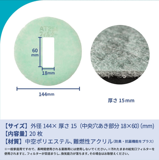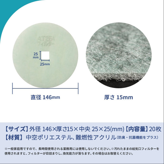 給気口グリル用【AT254】フィルター「QMA1」サイズ 20枚入り 大きさ:Φ147mm/□25mm 厚さ:15mm 内径□型穴あき