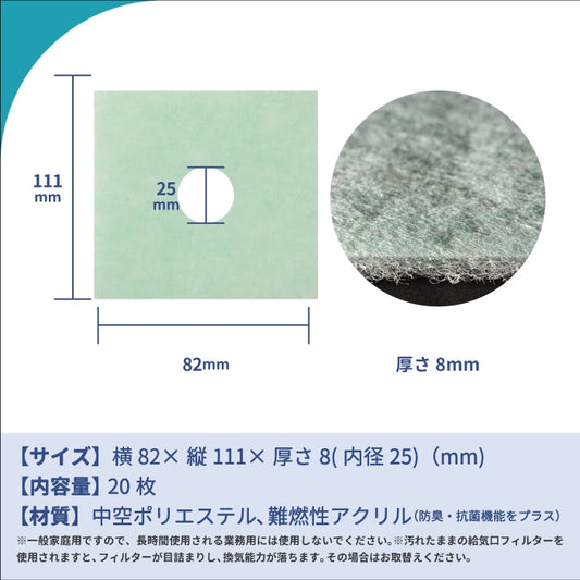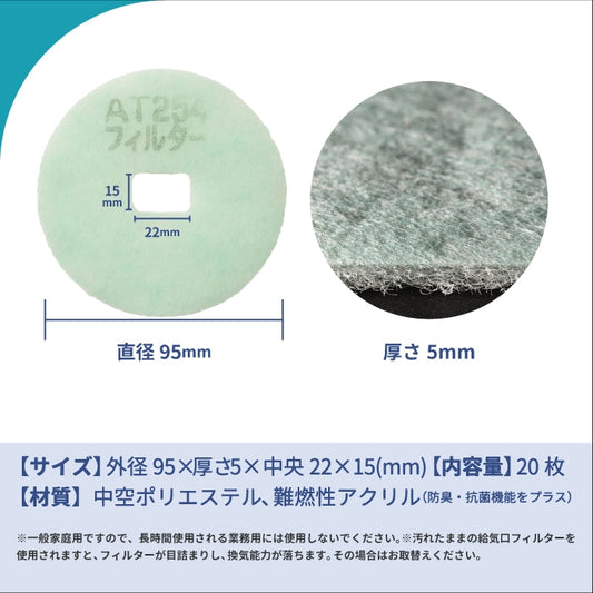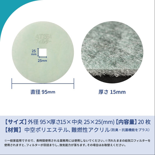 給気口グリル用【AT254】フィルター「QMA2」サイズ 20枚入り 大きさ:Φ95mm/□25mm 厚さ:15mm 内径□型穴あき