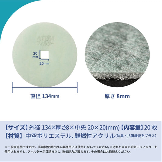 給気口グリル用【AT254】フィルター「QP12」サイズ 20枚入り 大きさ:Φ134mm/□20mm 厚さ:8mm 内径□穴あき