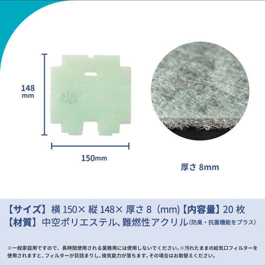 給気口グリル用【AT254】フィルター「QK3」サイズ 20枚入り 大きさ:ヨコ150mm×タテ148mm 厚さ:8mm 穴あきスリット入り