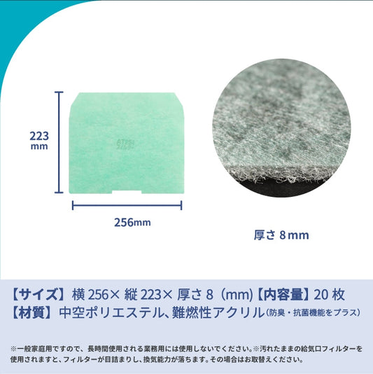給気口グリル用【AT254】フィルター「QM5」サイズ 20枚入り 大きさ:ヨコ256mm x タテ223mm 厚さ:8mm 上角無し 下面凹有り