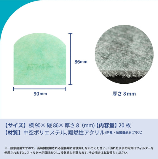 給気口グリル用【AT254】フィルター「QN20」サイズ 20枚入り 大きさ:ヨコ90mm x タテ85mm 厚さ:8mm