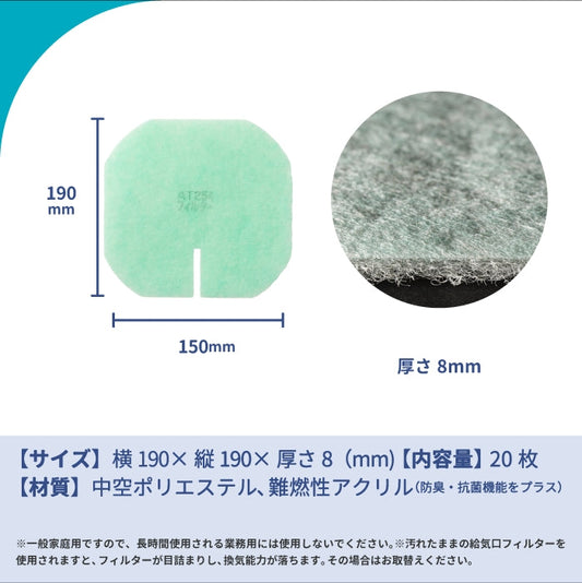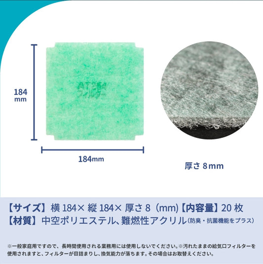 給気口グリル用【AT254】フィルター「QX3」サイズ 20枚入り 大きさ:ヨコ184mm x タテ184mm 厚さ:8mm 角無し