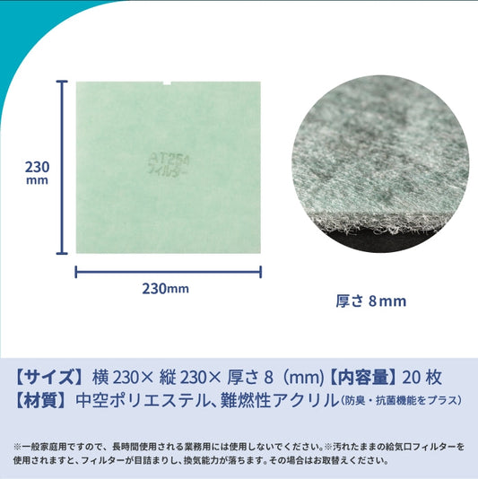 給気口グリル用【AT254】フィルター「QU1」サイズ 20枚入り 大きさ:ヨコ230mm x タテ230mm 厚さ:8mm 上辺凹あり