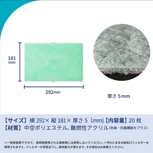 給気口グリル用【AT254】フィルター「QU8」サイズ 20枚入り 大きさ:ヨコ192mm x タテ292mm 厚さ:5mm 上下凸タイプ