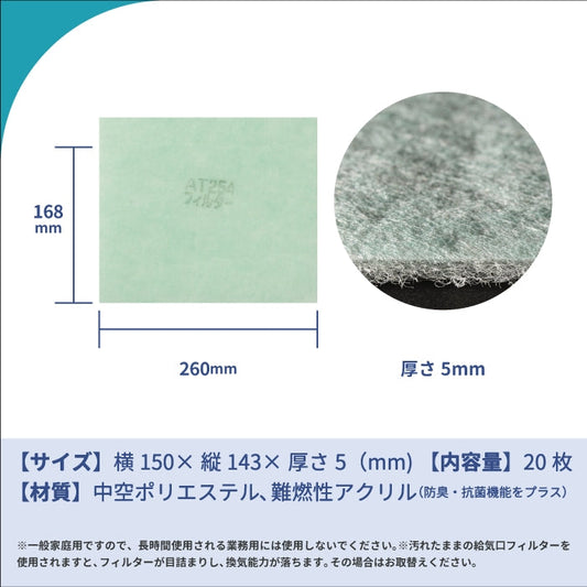 給気口グリル用【AT254】フィルター「QBR5」サイズ 20枚入り 大きさ:ヨコ150mm x タテ143mm 厚さ:5mm