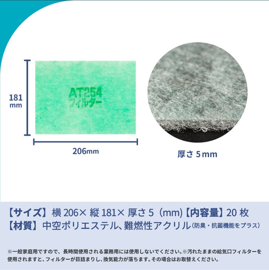 給気口グリル用【AT254】フィルター「QK19」サイズ 20枚入り 大きさ:ヨコ206mm x タテ181mm 厚さ:5mm