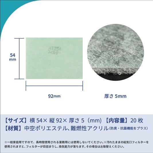 給気口グリル用【AT254】フィルター「QK20」サイズ 20枚入り 大きさ:ヨコ92mm x タテ54mm 厚さ:5mm