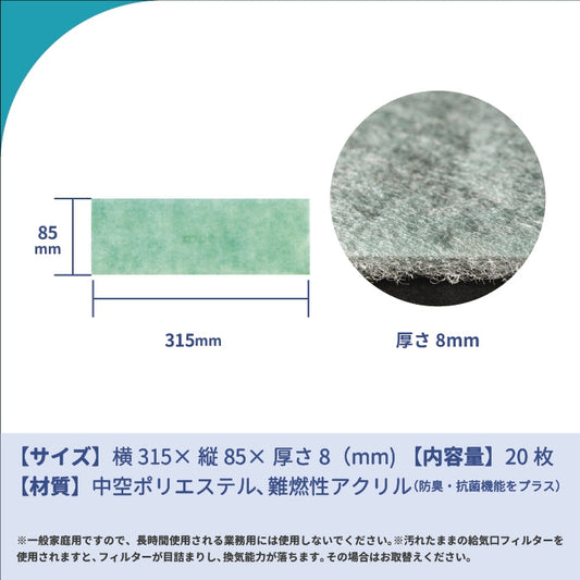 給気口グリル用【AT254】フィルター「QM19」サイズ 20枚入り 大きさ:ヨコ315mm x タテ85mm 厚さ:8mm ロスナイ用フィルター