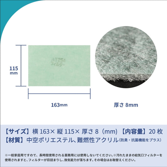 給気口グリル用【AT254】フィルター「QM11」サイズ 20枚入り 大きさ:ヨコ135mm x タテ35mm 厚さ:8mm ロスナイ用フィルター