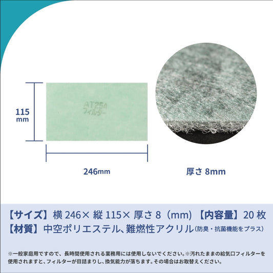 給気口グリル用【AT254】フィルター「QM22」サイズ 20枚入り 大きさ:ヨコ246mm x タテ115mm 厚さ:8mm ロスナイ用フィルター