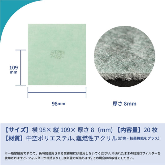 給気口グリル用【AT254】フィルター「QBR4」サイズ 20枚入り 大きさ:ヨコ105mm x タテ97mm 厚さ:8mm