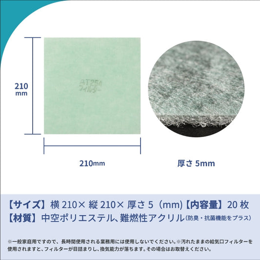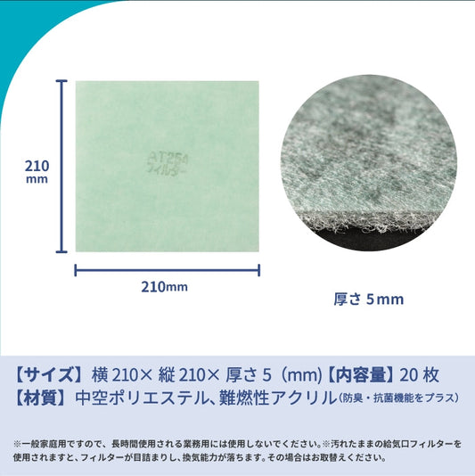給気口グリル用【AT254】フィルター「QM28」サイズ 20枚入り 大きさ:ヨコ210mm x タテ210mm 厚さ:5mm