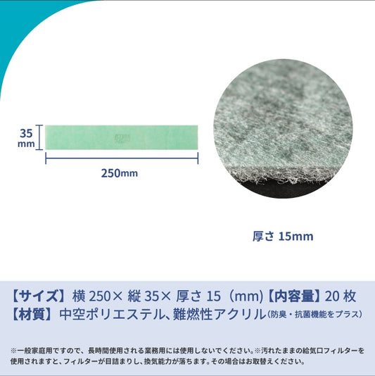 給気口グリル用【AT254】フィルター「QM30」サイズ 20枚入り 大きさ:ヨコ250mm x タテ35mm 厚さ:15mm