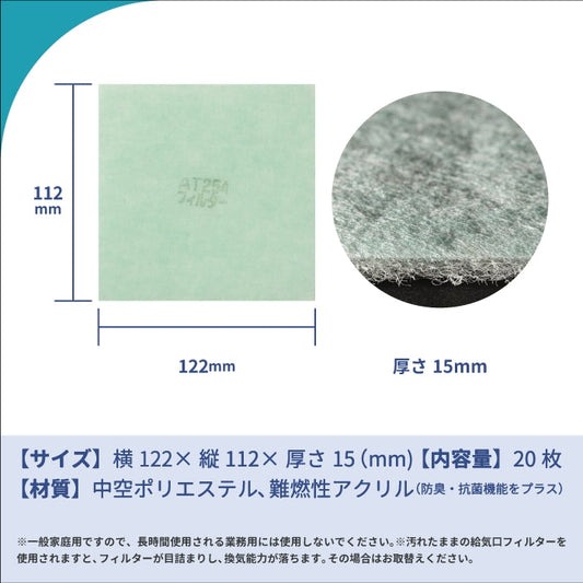 給気口グリル用【AT254】フィルター「QM31」サイズ 20枚入り 大きさ:ヨコ122mm x タテ112mm 厚さ:15mm