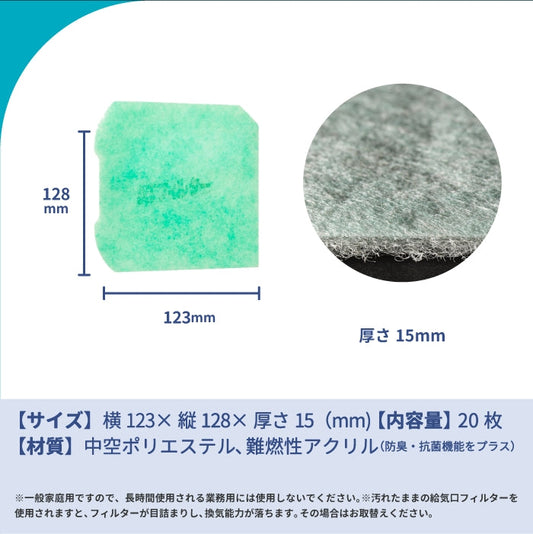 給気口グリル用【AT254】フィルター「QX1」サイズ 20枚入り 大きさ:ヨコ150mm x タテ138mm 厚さ:15mm