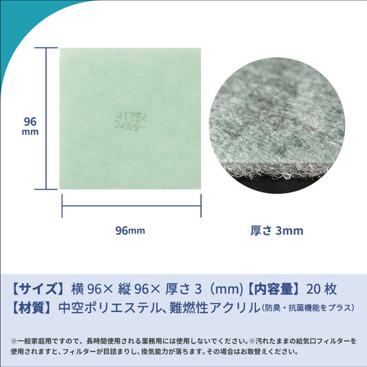 給気口グリル用【AT254】フィルター「QU9」サイズ 20枚入り 大きさ:ヨコ96mm x タテ96mm 厚さ:3mm