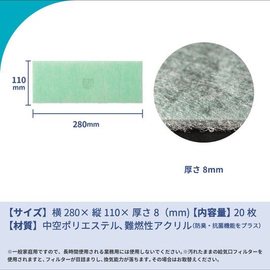 給気口グリル用【AT254】フィルター「QX5」サイズ 20枚入り 大きさ:ヨコ280mm x タテ115mm 厚さ:8mm