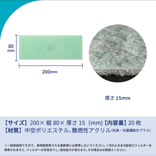 給気口グリル用【AT254】フィルター「QX7」サイズ 20枚入り 大きさ:ヨコ80mm x タテ200mm 厚さ:15mm