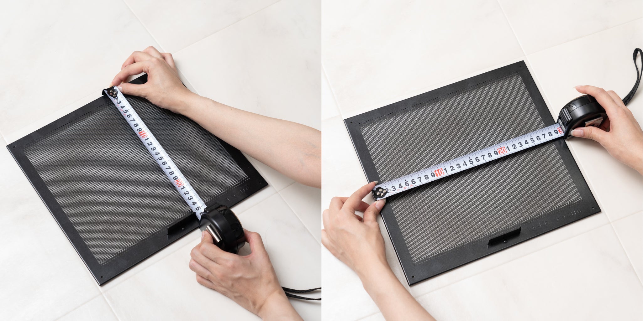 既存のレンジフードフィルター枠のサイズを測るために付属の金網フィルターを外してください。
