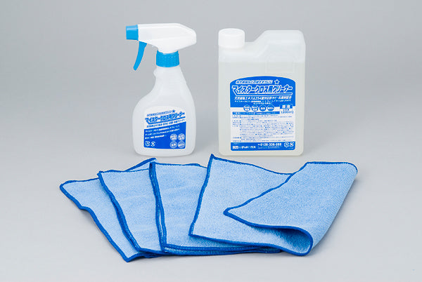 マイスタークロス用クリーナーをスプレーしてサッと拭くだけでミクロのホコリや汚れを取り、防カビ・抗菌・消臭効果抜群!セット内容「マイスタークロス 4枚 / マイスタークロス用クリーナー原液 1リットル / スプレー容器300ml用 / 専用収納袋」